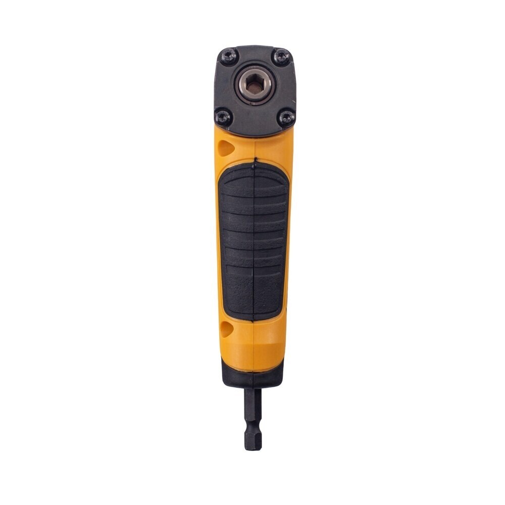 Предназначен для совместного использования с шуруповертами и винтовертами в роли удлиняющего элемента при закручивании шурупов, болтов или винтов в труднодоступных местах и в условиях ограниченного пространства. Насадка имеет резиновое покрытие для удобства работы. Снабжена торсионом и специальным дизайном редуктора для работы с импульсным инструментом. Подходит для всех видов оснастки с хвостовиком 1/4 «.