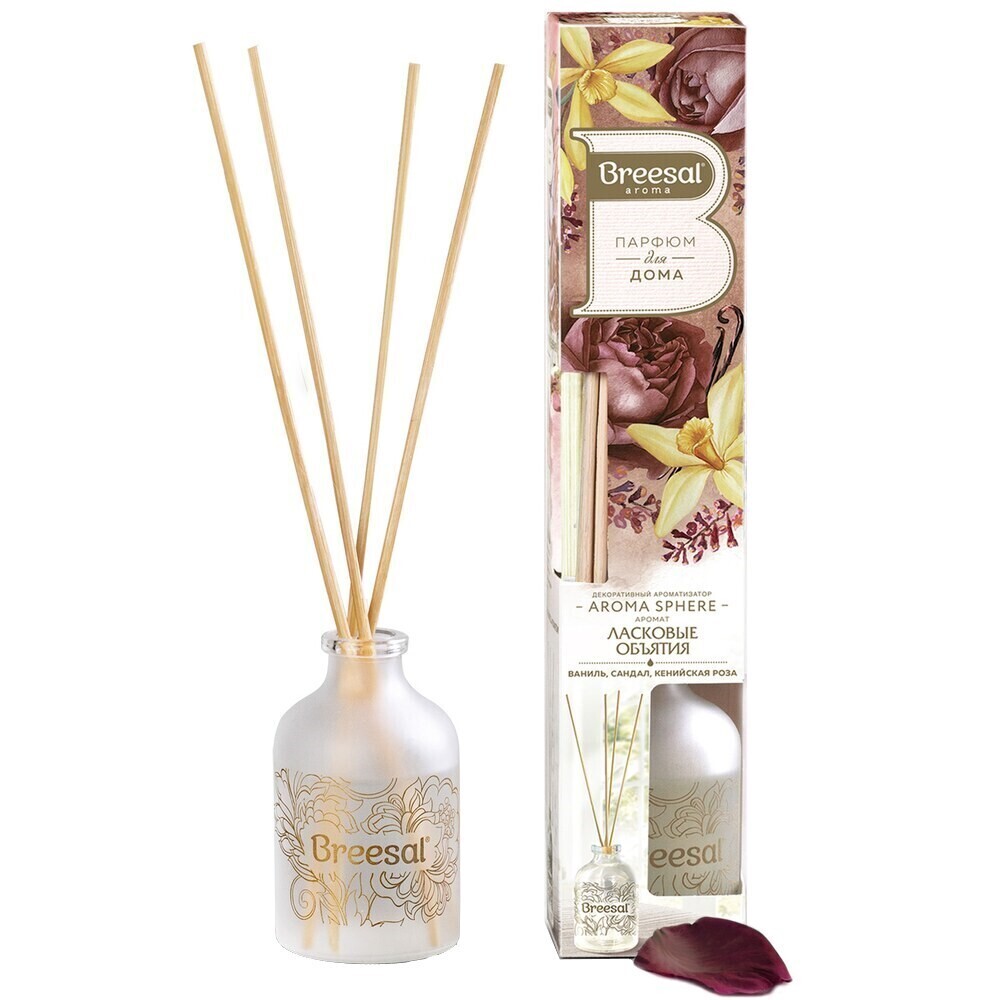 Диффузор ароматический для дома Breesal – это многогранный аромат в стеклянном флаконе с натуральными древесными палочками, который впишется в любой интерьер и создаст в нем особую атмосферу. Просто откройте флакон и опустите палочки в ароматический диффузор для дома. Сделанные из натурального ротанга, они быстро наполнятся жидкостью и будут отдавать аромат медленно и равномерно, поэтому вы сможете наслаждаться им до 30 дней. Регулировать интенсивность ароматизатора для дома можно добавлением или уменьшением количества палочек, а если аромат станет менее ощутим, достаточно перевернуть палочки во флаконе аромадиффузора.