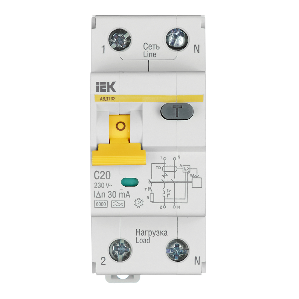 Расшифровка маркировки: 1P+N — 1 полюс плюс нейтраль (для использования в однофазных сетях), 20А — величина номинального тока в амперах, тип С – автомат срабатывает при токе в цепи в 5-10 раз больше номинального и применяется для защиты цепей розеток и освещения, 30мА – номинальный отключающий дифференциальный ток в миллиамперах, 6кА — рабочая отключающая способность в килоамперах, ИЭК — фирма производитель, АВДТ 32 — серия автоматов с повышенной отключающей способностью.