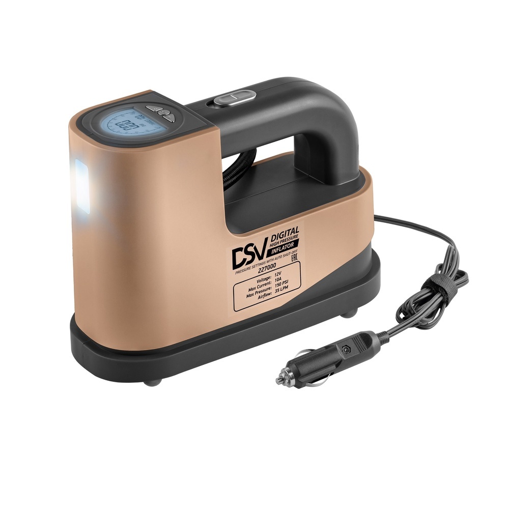 Цифровой компрессор с автостопом DSV, оснащенный: LED фонарем, набором переходных штуцеров, может использоваться для накачивания шин автомобилей и другого транспорта, различных надувных изделий, спортивного инвентаря. Производительность 35 л/мин обеспечивает комфортную скорость накачивания.