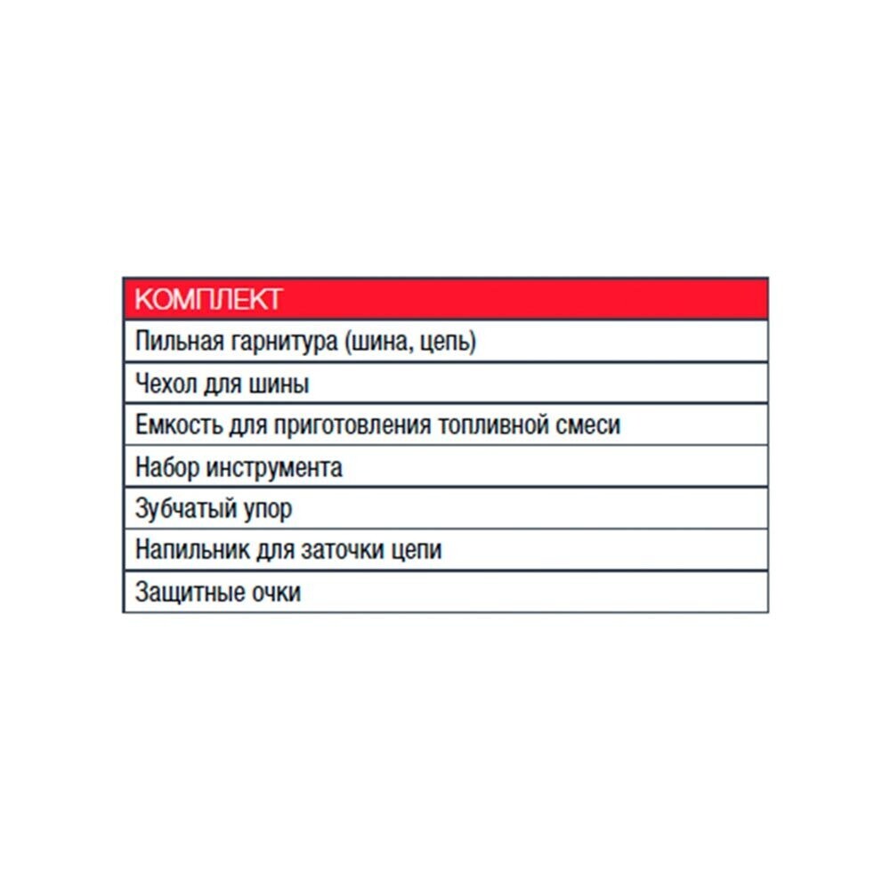 Бензопила – 1 шт., пильная гарнитура (шина, цепь) – 1 компл., чехол для шины – 1 шт., емкость для приготовления топливной смеси – 1 шт., набор инструмента -1 шт., зубчатый упор – 1 шт., напильник для заточки цепи – 1 шт., защитные очки – 1 шт.