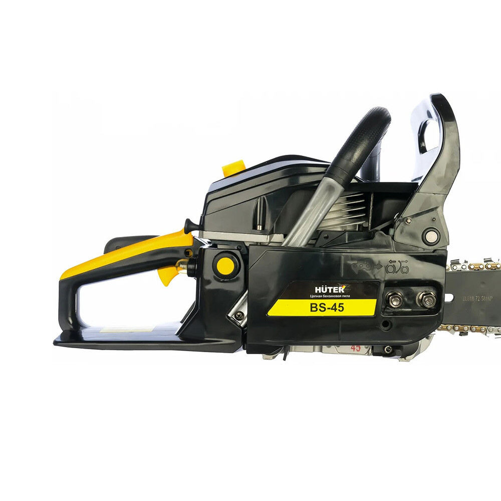 Бензопила Huter BS-45 справится с валкой невысоких деревьев и заготовкой дров, работой с пиломатериалами во время строительства. Прибор оснащен компактной 450-миллиметровой шиной и цепью с толщиной звена 1,5 мм. Количество звеньев составляет 72 шт. с шагом 0,325″, что обеспечивает низкую «агрессивность» при распиле и легкость управления. Инструмент оснащен мощным бензиновым двигателем 3,1 л.с. с объемом 45 см³. Huter BS-45 может работать длительное время за счет вместительного топливного бака 550 мл, для заправки которого необходима смесь на основе бензина и полусинтетического масла для двухтактных двигателей.