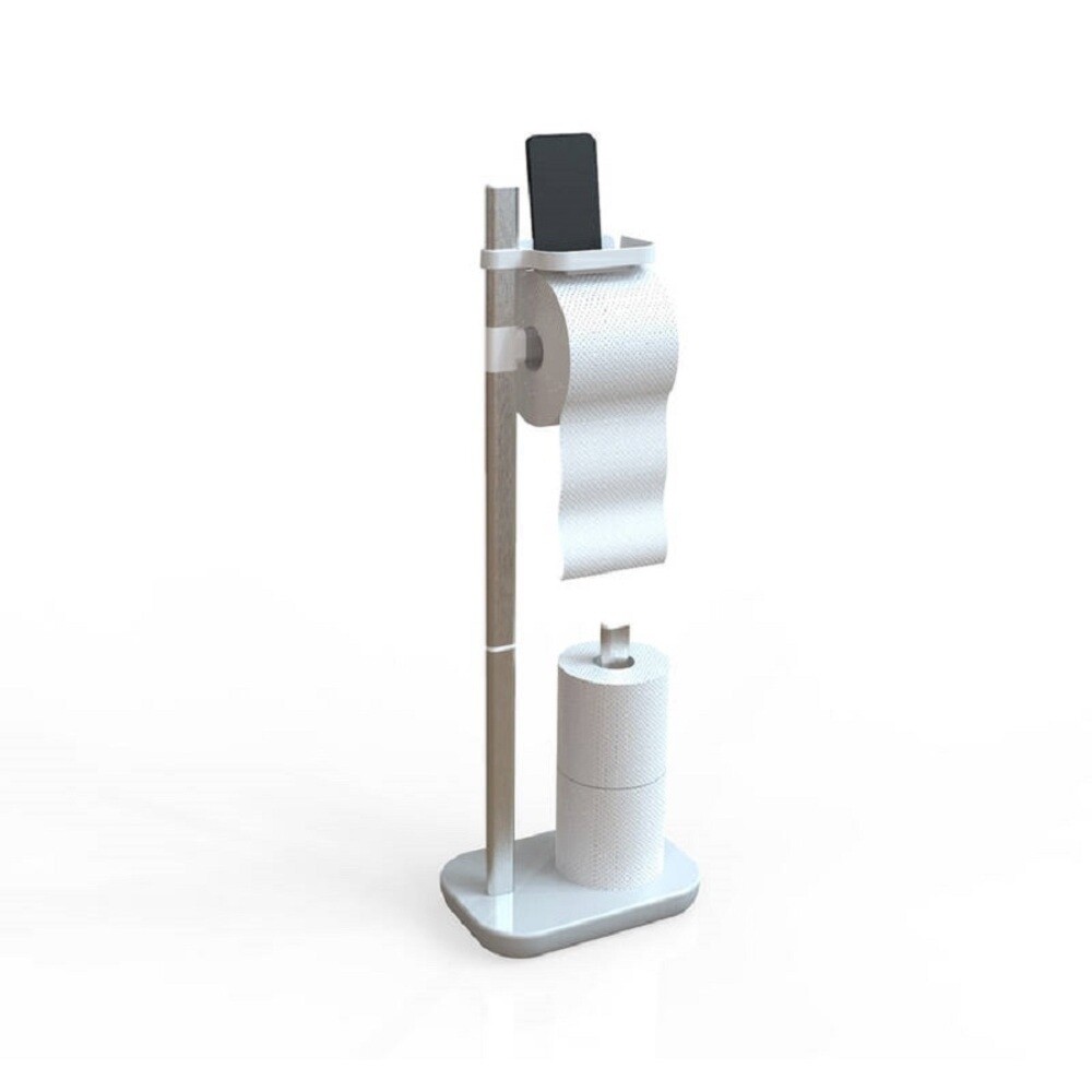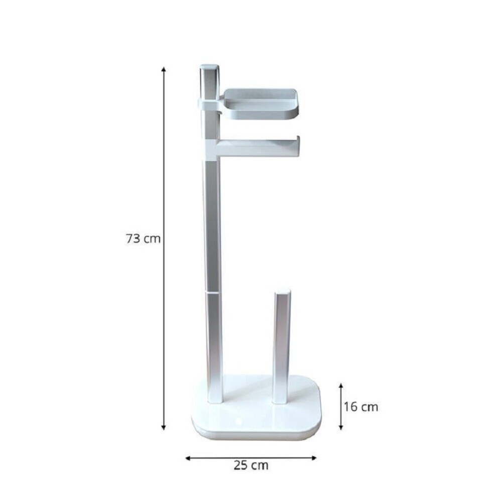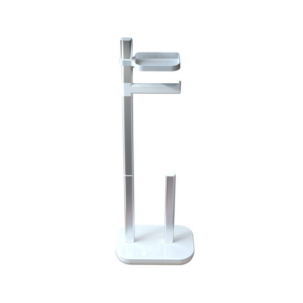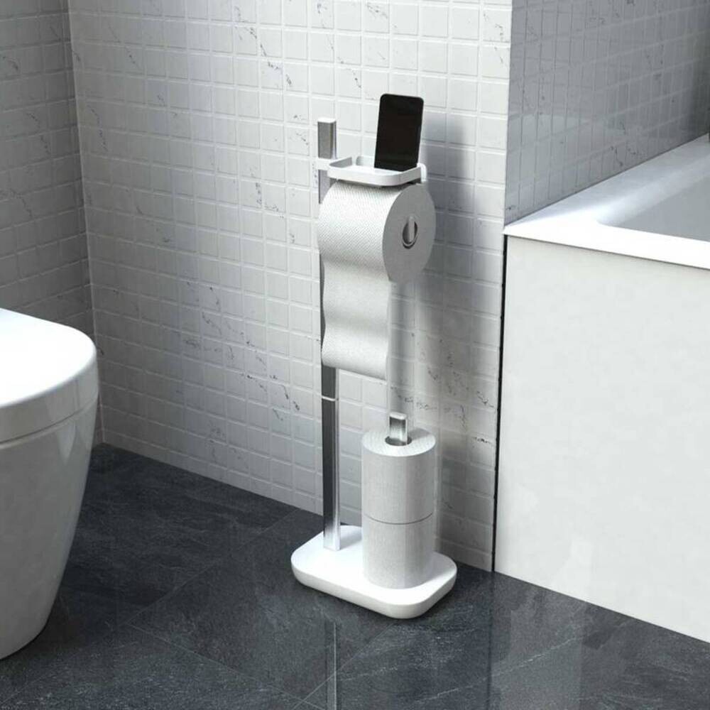 Стойка для туалетной бумаги изготовлена из пластика, алюминия. В комплекте – полка, держатель для трех запасных рулонов бумаги.