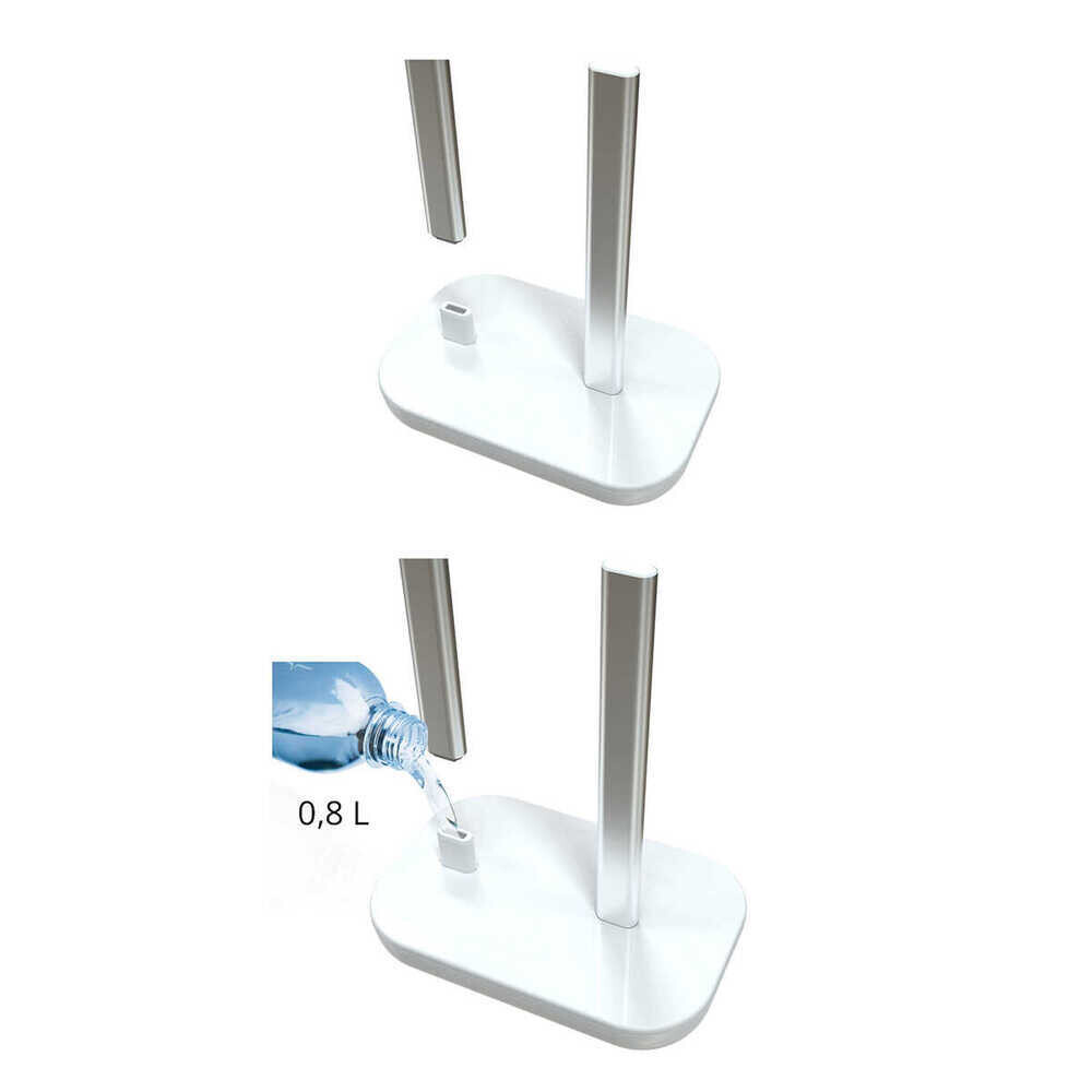 Стойка для туалетной бумаги изготовлена из пластика, алюминия. В комплекте – полка, держатель для трех запасных рулонов бумаги. Для устойчивости стойки предусмотрено отверстие для заполнения основания водой.