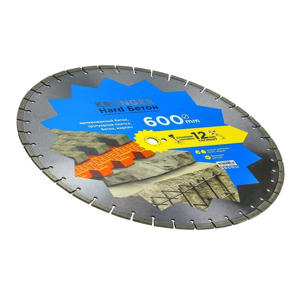 Алмазный диск диаметром 600 мм Hard Бетон Kronger предназначен для работы с железобетоном, кирпичом и тротуарной плиткой.