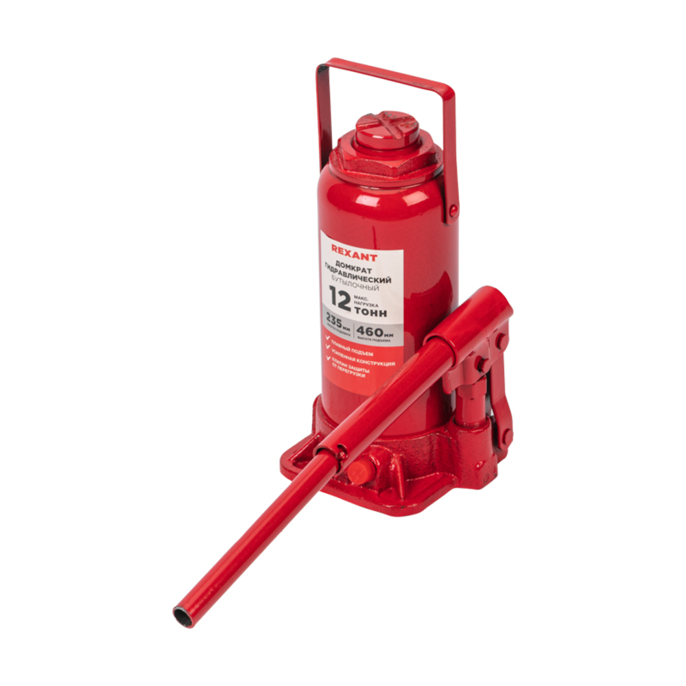Гидравлический бутылочный домкрат Rexant поднимает грузы массой до 12 тонн на высоту до 465 мм. Оптимален для автомобилей с большим клиренсом. Будет полезен автолюбителям при проведении технического обслуживания и ремонта, а также для профессионалов на СТО. Отличается плавностью хода, надежностью и жесткостью конструкции. Клапан безопасности не дает поднимать груз тяжелее 12 т, предохраняя домкрат от поломки.