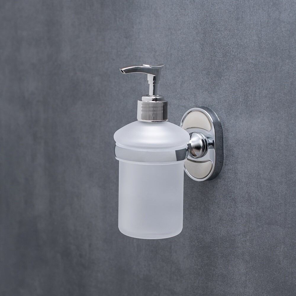 Дозатор подвесной с держателем предназначен для порционной подачи мыла, шампуней и других гелеобразных жидкостей. Изготовлен из матового стекла.