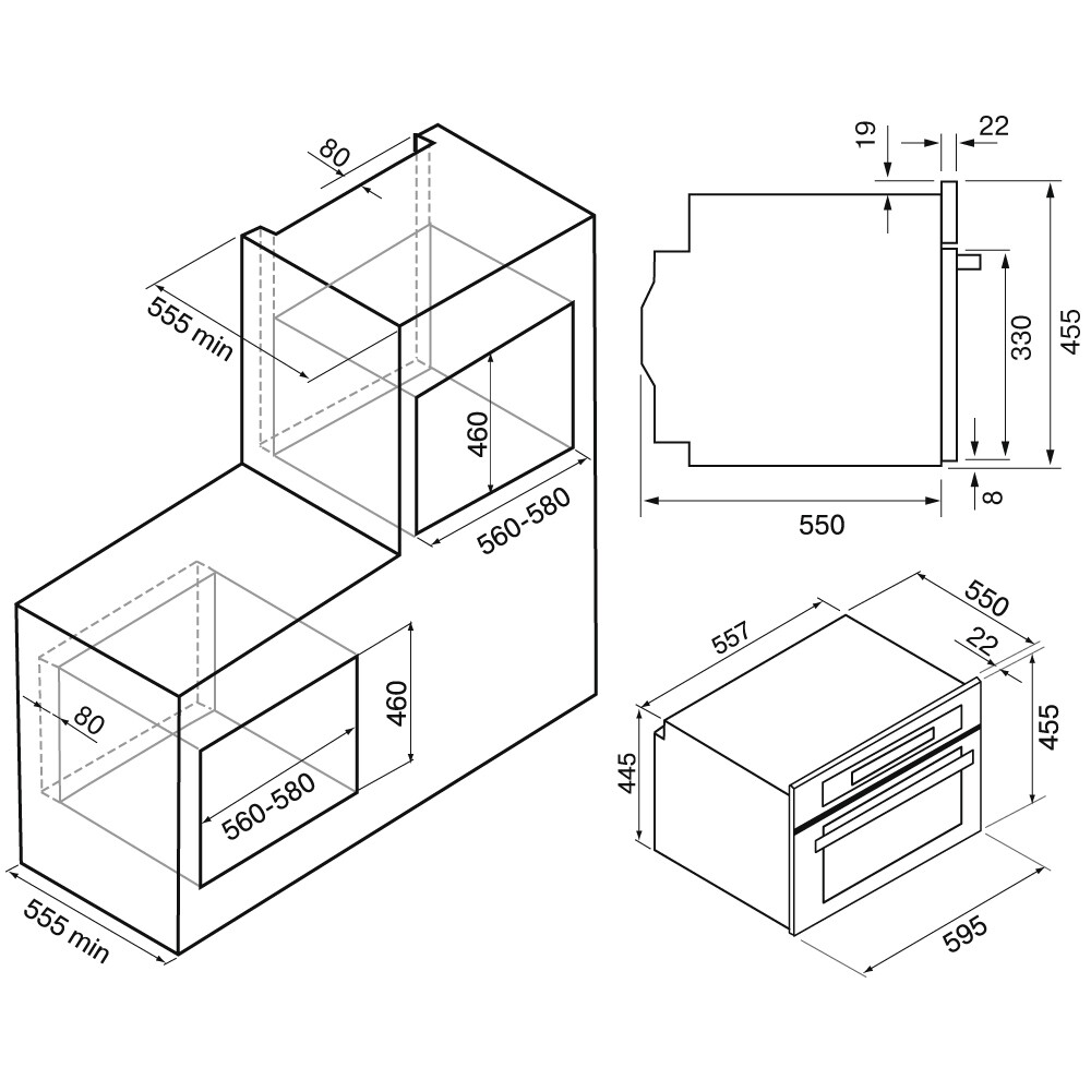 Комплектация: духовой шкаф, глубокий противень, решетка для гриля, монтажный комплект.