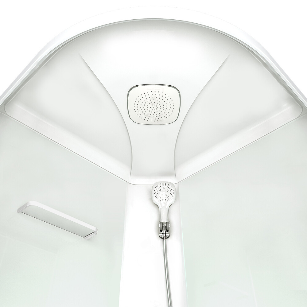 Поддон акриловый в комплекте с каркасом и экраном, комплект стекол, комплект стенок, крыша, верхний тропический душ, ручная лейка, держатель ручной лейки с регулировкой наклона, смеситель с металлическим ручками, полочка для мыльных принадлежносте…