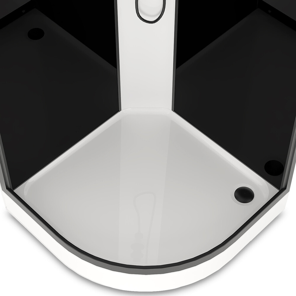 Душевая кабина с низким поддоном, черными стенками и прозрачным стеклом. Кабина закрытого типа с крышей. Данная модель сочетает в себе высокие эксплуатационные характеристики, стильный дизайн и доступную цену. С целью достижения увеличенной жесткости конструкции горизонтальный профиль ложится на бортик поддона (а не рядом с бортиком) и не имеет движения по поддону, а отсутствие зазора между профилем и бортиком поддона препятствует скоплению грязи. Установка такой душевой кабины не займет много времени и сил.