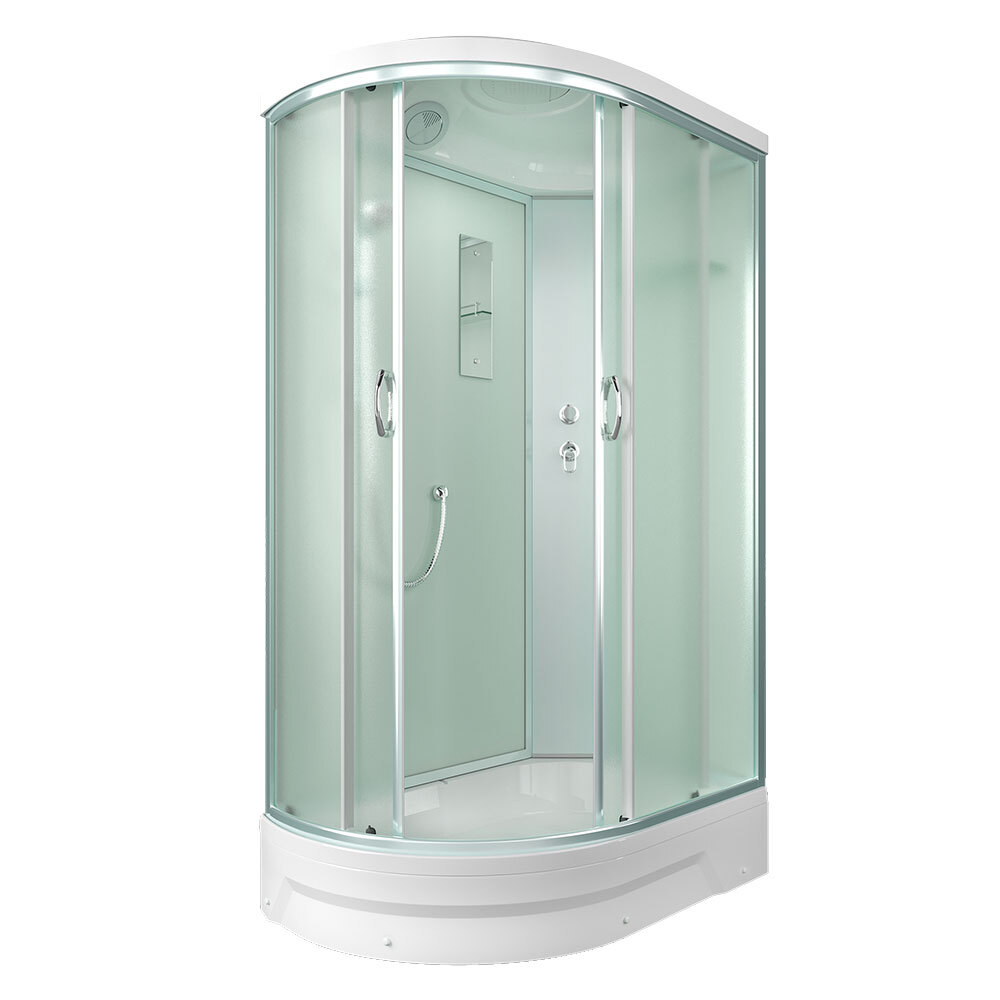 Душевая кабина предназначена для принятия водных процедур. Поддон изготовлен из европейского сантехнического акрила, армировка – стеклоровинг, с дополнительным усилением дна влагостойким ДСП 16 мм. Допустимая нагрузка – 370 кг, диаметр слива — 50 мм. В производстве душевой кабины используется только термически закаленное стекло.