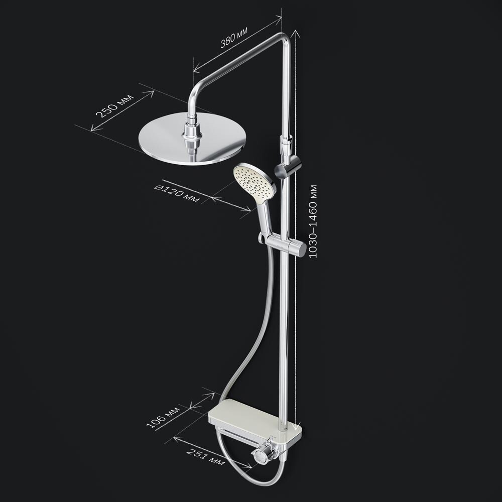 Смеситель выполнен в виде полочки. Увеличенный диаметр душевых леек (верхний душ 220 мм и ручной душ 120 мм) позволит ощутить преимущества тропического душа, тогда как увеличенная длина шланга 1750 мм обеспечит свободу движений во время принятия душа. Телескопическая поворотная штанга регулируется по высоте в диапазоне от 1030 до 1460 мм обеспечивая комфорт для людей любого роста, а шаровой шарнир в держателе верхнего душа позволяет регулировать угол его наклона. Переключатель расположен за ручкой настройки температуры и позволяет менять источник потока воды от ручной лейки и излива до верхнего душа.