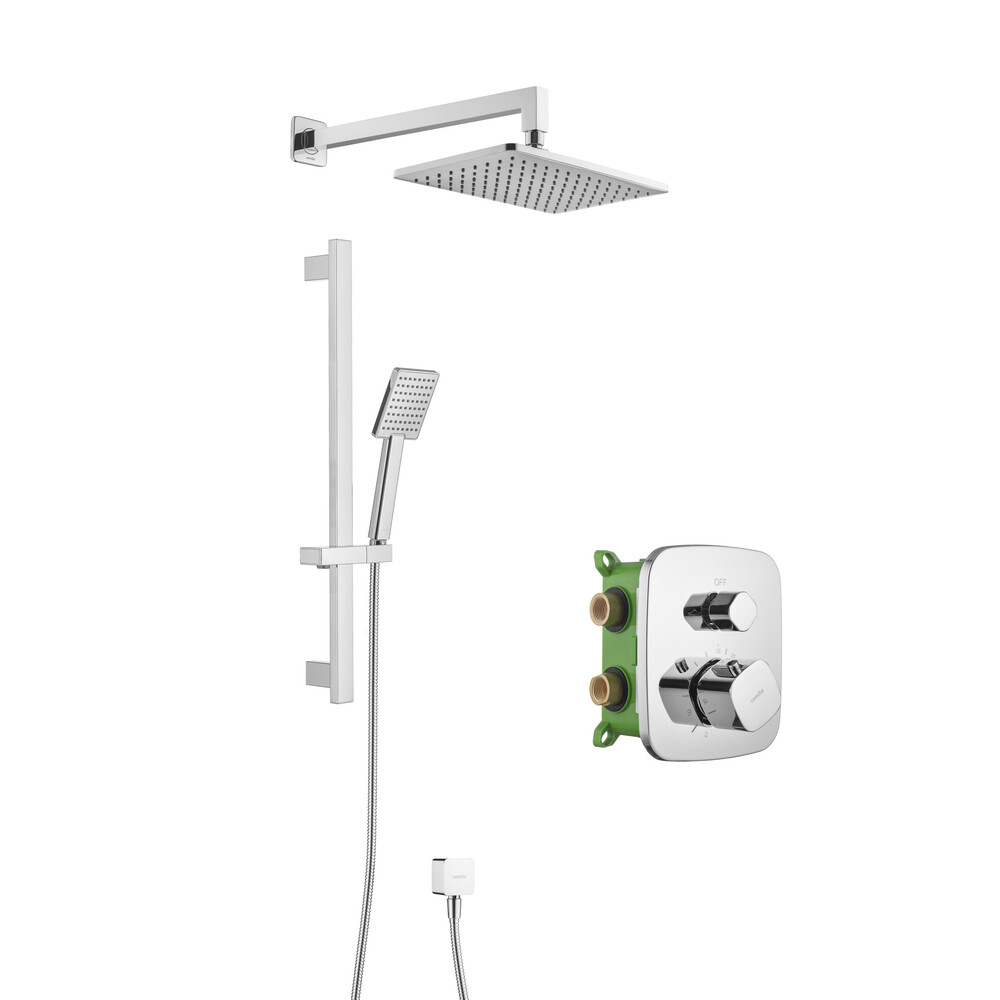 Душевой комплект выполнен в элегантном хромированном исполнении, станет эффектным акцентом в вашей ванной комнате и обеспечит максимальное удовольствие от принятия душа. Встроенный термостат позволяет точно регулировать температуру воды, обеспечивая комфорт и безопасность во время принятия душа, исключая резкие перепады температуры. Смеситель на 2 выхода гарантирует удобное переключение между верхним душем и ручным душем, что делает использование максимальным комфортом и гибкостью в выборе. Широкая головка верхнего душа создает эффект дождя, гарантируя равномерное и мягкое распределение воды для полноценного расслабления.