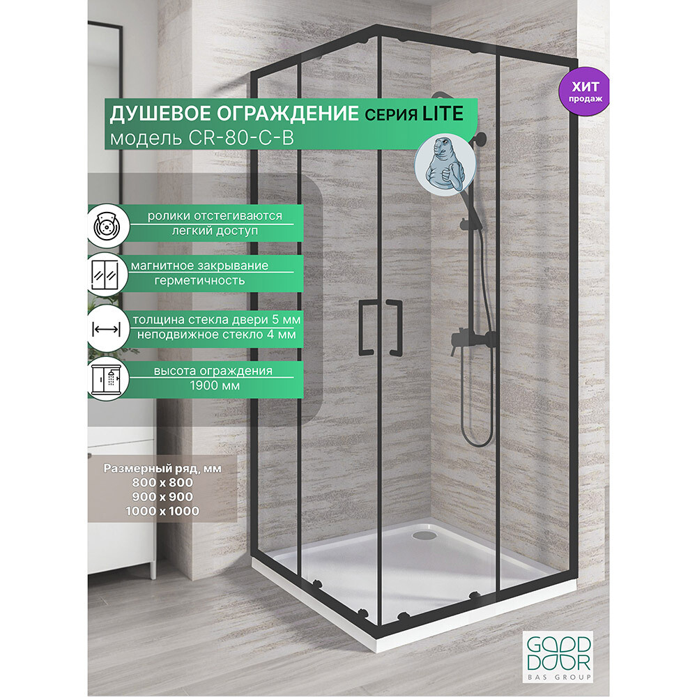 Душевой уголок Good Door Lite CR-80-C-B черный 80х80х190 см квадрат стекло прозрачное 5 мм (ЛТ00025)