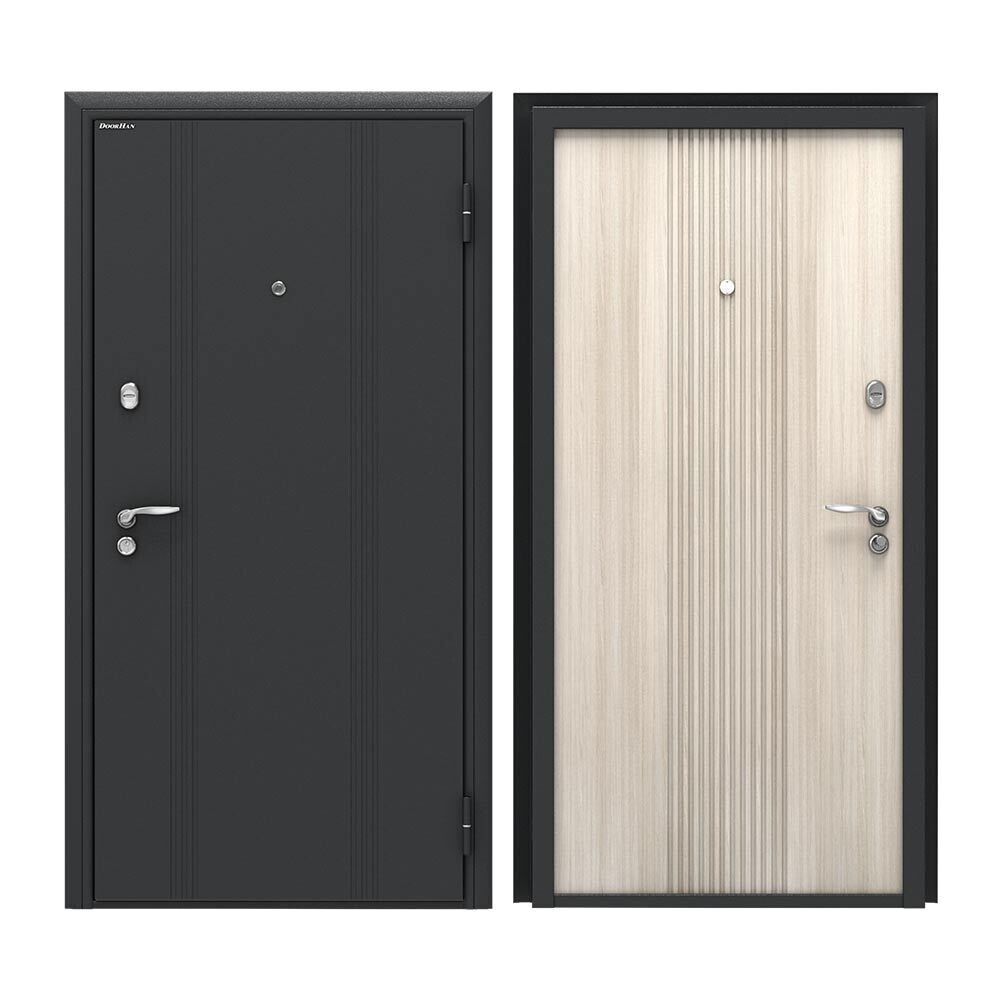 Входная дверь DoorHan Оптим предназначена для городских квартир. При качественных материалах в составе изделия и комплектующих, модель можно отнести к демократичному ценовому сегменту. Отличительная особенность — дверь полностью изготовлена из холоднокатаной оцинкованной стали с использованием технологии бесшовного производства с 2-мя листами металла, заполнение всего полотна огнестойкой минераловатной плитой высокой плотности. Снаружи стальной лист металла 0,8 мм с антивандальными свойствами Букле в темно-сером цвете, изнутри МДФ панель с ХДФ пленкой Рейн перламутр.
