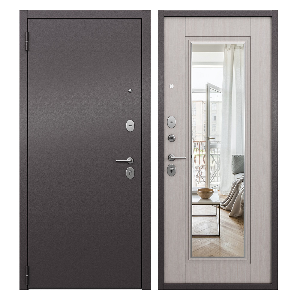Предназначена для установки в жилых и общественных зданиях в качестве входной двери внутри помещения. Стальная дверь используется для установки в квартирах, загородных домах и офисах. Дверь обладает высокой устойчивостью к повреждению, приятный эстетичный вид. На внутренней стороне смонтировано зеркало, облицовано фрезерованной МДФ-панелью, цвет «Ларче бьянко».
