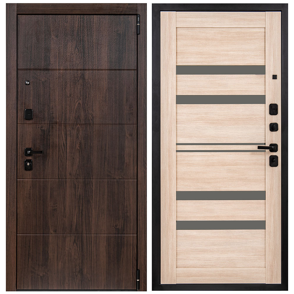 Дверной стальной однопольный блок с открыванием наружу. Дверь предназначена для установки в жилых и общественных зданиях в качестве входной двери внутри помещения. Цельногнутая конструкция полотна и закрытый цельнокатаный профиль коробки. Стальной лист с атмосферостойким порошковым покрытием цвет «Лунный камень» декорированный панелью МДФ 10 мм. С внутренней стороны облицовано царговой МДФ-панелью толщиной 22 мм, цвет «Cappuccino Veralinga». Три горизонтальных усиливающих омега-профиля (ребра) создают единую монолитную жесткость и прочность конструкции. Две наружные петли на опорных подшипниках. Два замка 4-го (высшего) класса взломостойкости. Цилиндровый механизм с вариантом исполнения «ключ-шток», взаимозаменяемый аналогичным вариантом. Встроенные в дверную коробку 3 гильзы из ABS-пластика обеспечивают тихую работу ригелей. Дверь крепится анкерными болтами (в комплект не входят и приобретаются отдельно) или с использованием монтажных пластин (6 шт. в комплекте).
