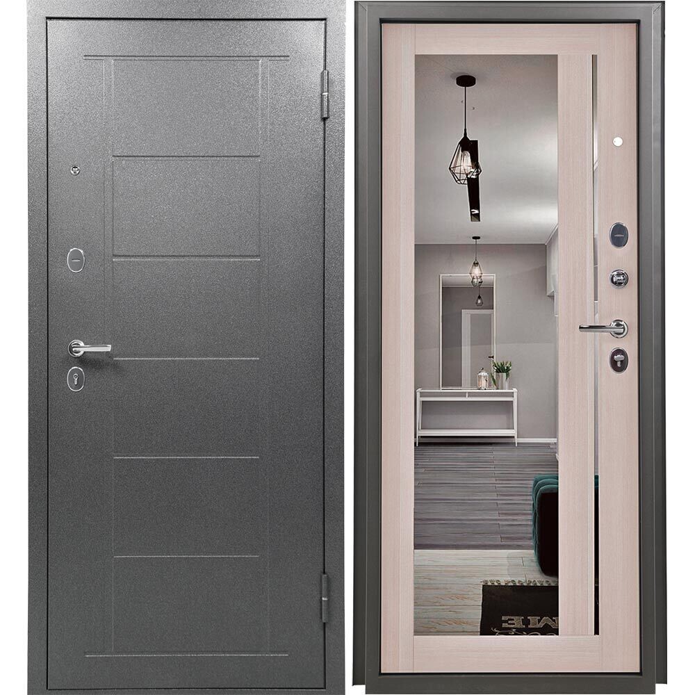 Дверь входная Промет Титан правая букле графит — беленый дуб с зеркалом 960х2050 мм