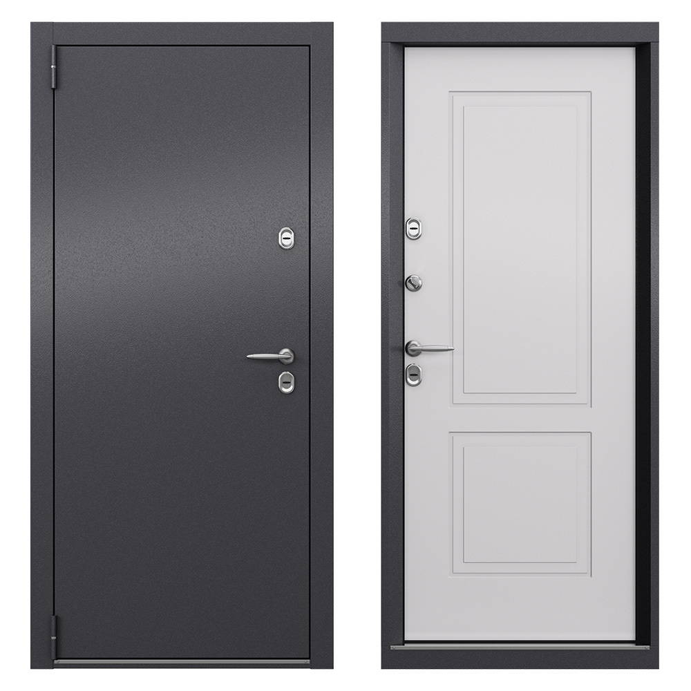 Наполнение полотна — пенополистирол + минеральная плита в ребрах жесткости с терморазрывом — фольгированный пенофол по периметру. Предназначена для установки в качестве уличной входной двери в частных домах, загородных коттеджах, таунхаусах, на границе улица/дом, в том числе в жилых и общественных зданиях. Для дверей, имеющих контакт с улицей, обязательно наличие козырька, защищающего от прямых воздействий осадков и солнечного света. Полотно изготовлено из стали, усиленное вертикальными ребрами жесткости. Стальной лист с атмосферостойким порошковым покрытием цвета «Темно-серый букле графит»; панель МДФ в цвете КТ Белый». Короб — цельногнутый профиль закрытого типа с терморазрывом МДФ 6 мм.