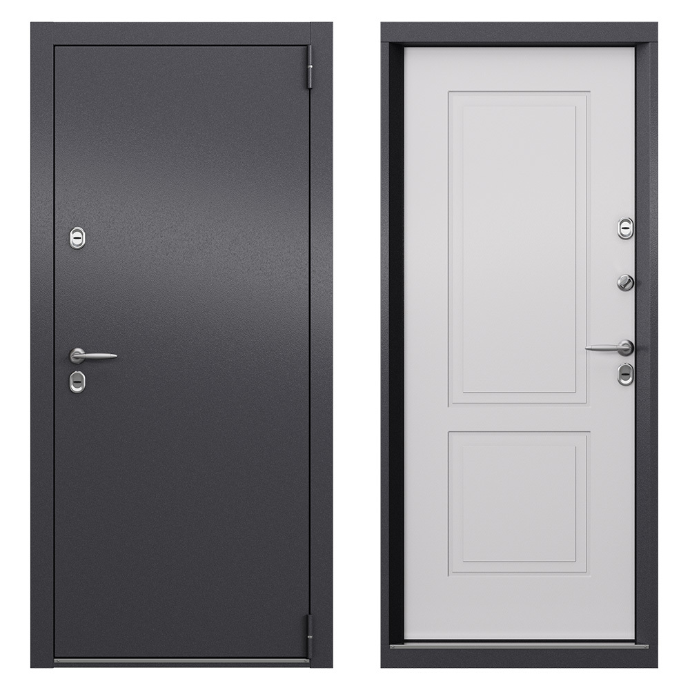 Наполнение полотна — пенополистирол + минеральная плита в ребрах жесткости с терморазрывом — фольгированный пенофол по периметру. Предназначена для установки в качестве уличной входной двери в частных домах, загородных коттеджах, таунхаусах, на границе улица/дом, в том числе в жилых и общественных зданиях. Для дверей, имеющих контакт с улицей, обязательно наличие козырька, защищающего от прямых воздействий осадков и солнечного света. Полотно изготовлено из стали, усиленное вертикальными ребрами жесткости. Стальной лист с атмосферостойким порошковым покрытием цвета «Темно-серый букле графит»; панель МДФ в цвете КТ Белый». Короб — цельногнутый профиль закрытого типа с терморазрывом МДФ 6 мм.