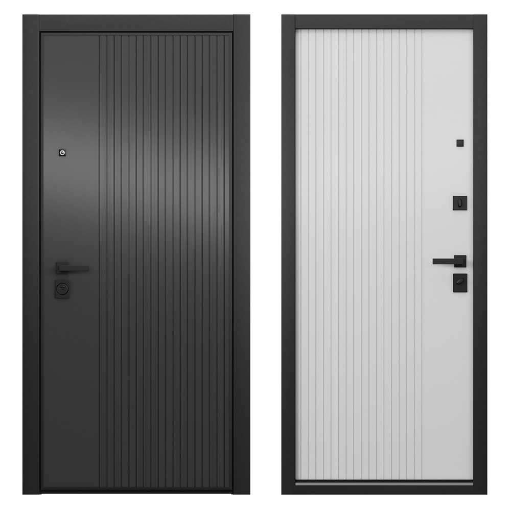 Предназначена для установки в жилых и общественных зданиях в качестве входной двери внутри помещения. Полотно изготовлено из стали, усиленное вертикальными ребрами жесткости. Стальной лист 2 мм с атмосферостойким порошковым покрытием цвета «Колоре неро»; панель МДФ в цвете «Бьянко». Наполнение — изолон, минеральная плита высокой плотности, пенофол, виброшумоизоляция SGM мембрана M2H. Короб — цельногнутый профиль закрытого типа+хромпакет, утепленный.