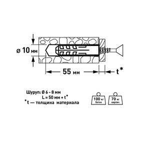 Предназначен для легких креплений (небольшие нагрузки) в бетон и полнотелый кирпич.