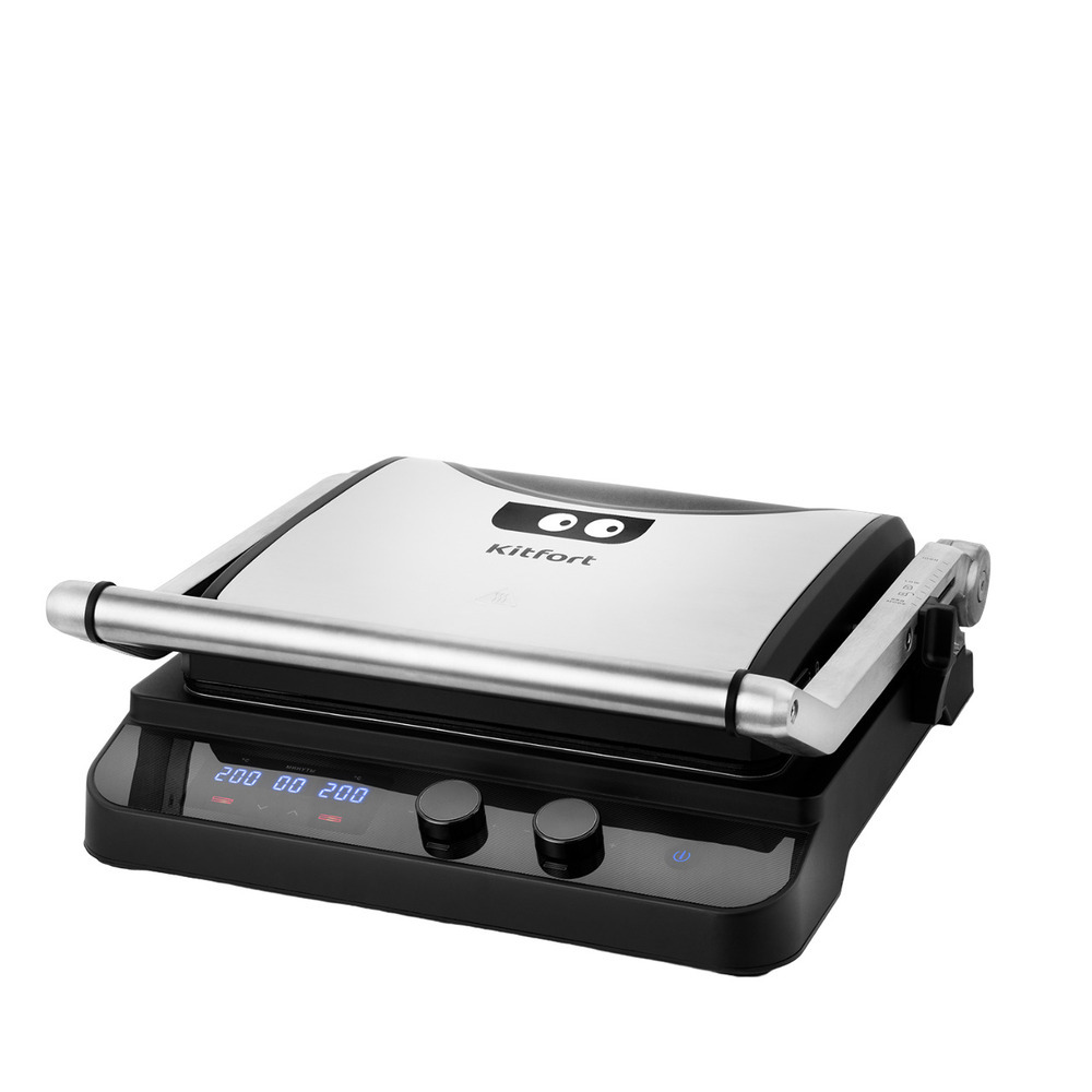 Панели изготовлены из алюминия с антипригарным покрытием. Они съемные и взаимозаменяемые, вы можете менять их местами, как вам будет удобнее. Независимые нагреватели. Гриль оснащен независимыми нагревателями верхней и нижней панели. Температуру каждой панели можно регулировать по отдельности вплоть до 230 °C с помощью электронного термостата. А также выставлять время приготовления с помощью таймера. Фиксация положения крышки. С помощью фиксатора можно установить крышку в нужное положение, не позволяя ей полностью закрыться и раздавить приготовляемые продукты.