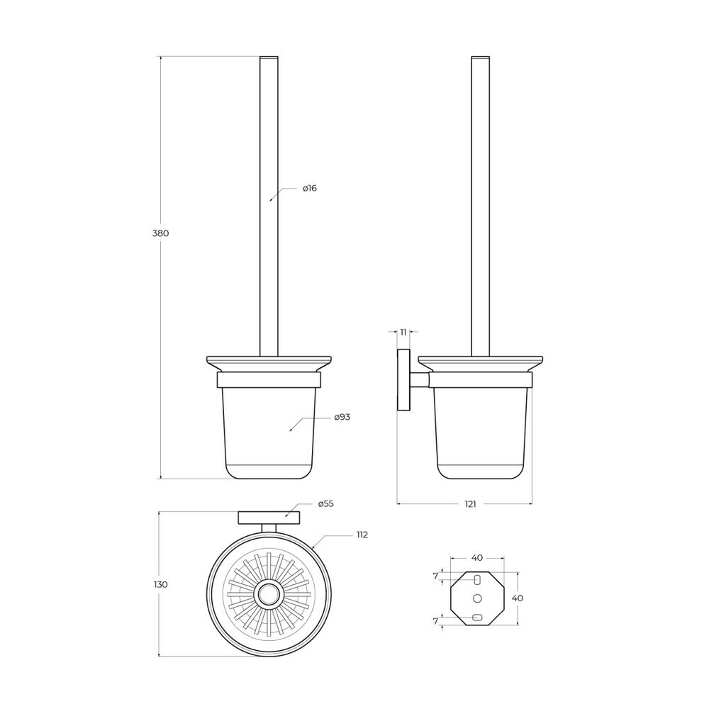 Ерш для унитаза подвесной выполнен из нержавеющей стали. Изделие включает в себя ерш и подставку. В уходе запрещены абразивные, кислотные и щелочные средства.