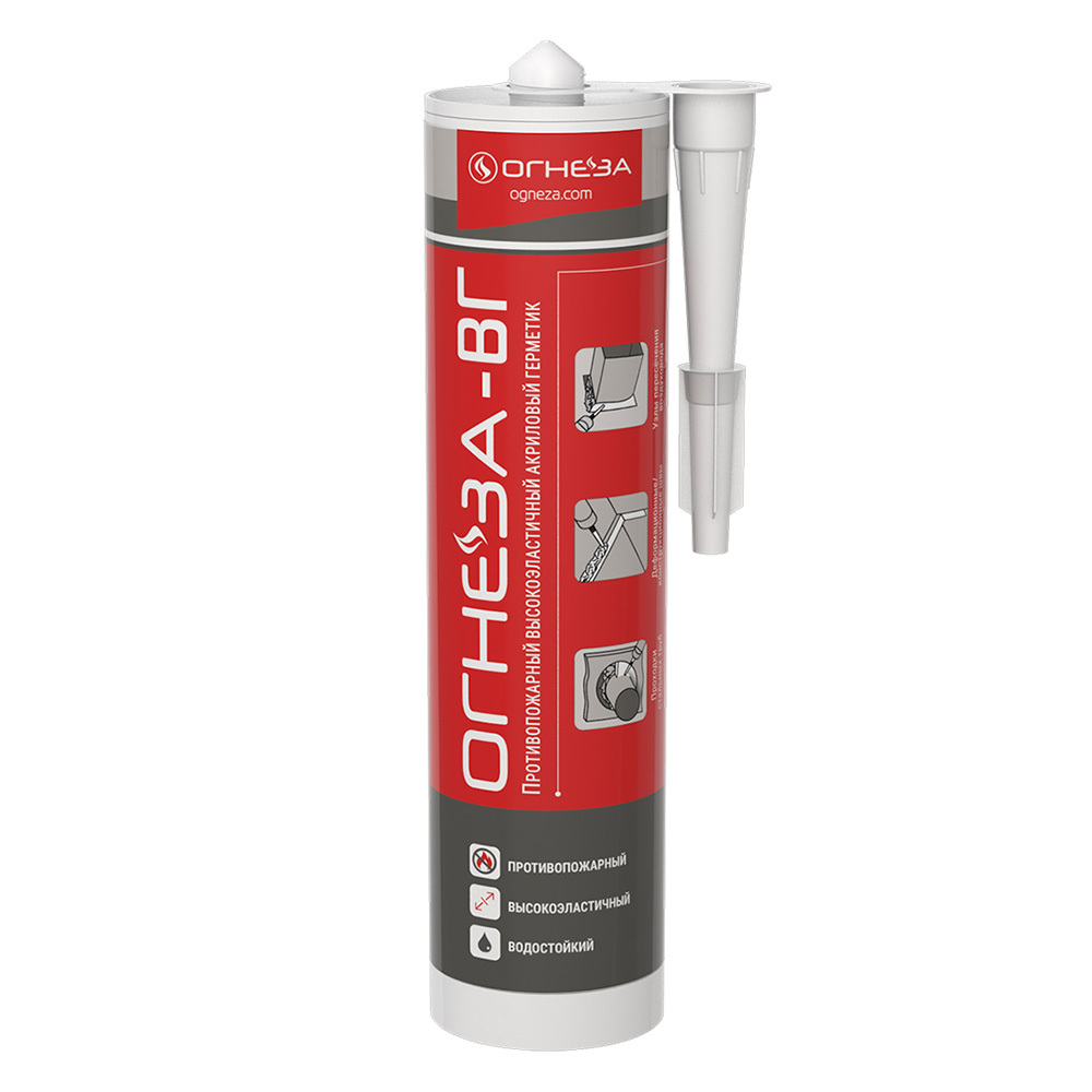 Противопожарный высокоэластичный водостойкий герметик «Огнеза-ВГ» на акриловой основе предназначен для заделки деформационных швов, универсальных проходок стальных труб и вентиляционных проходок. При воздействии огня высокоэластичный акриловый герметик уплотняется и обеспечивает высокий уровень огнестойкости – до 240 минут.