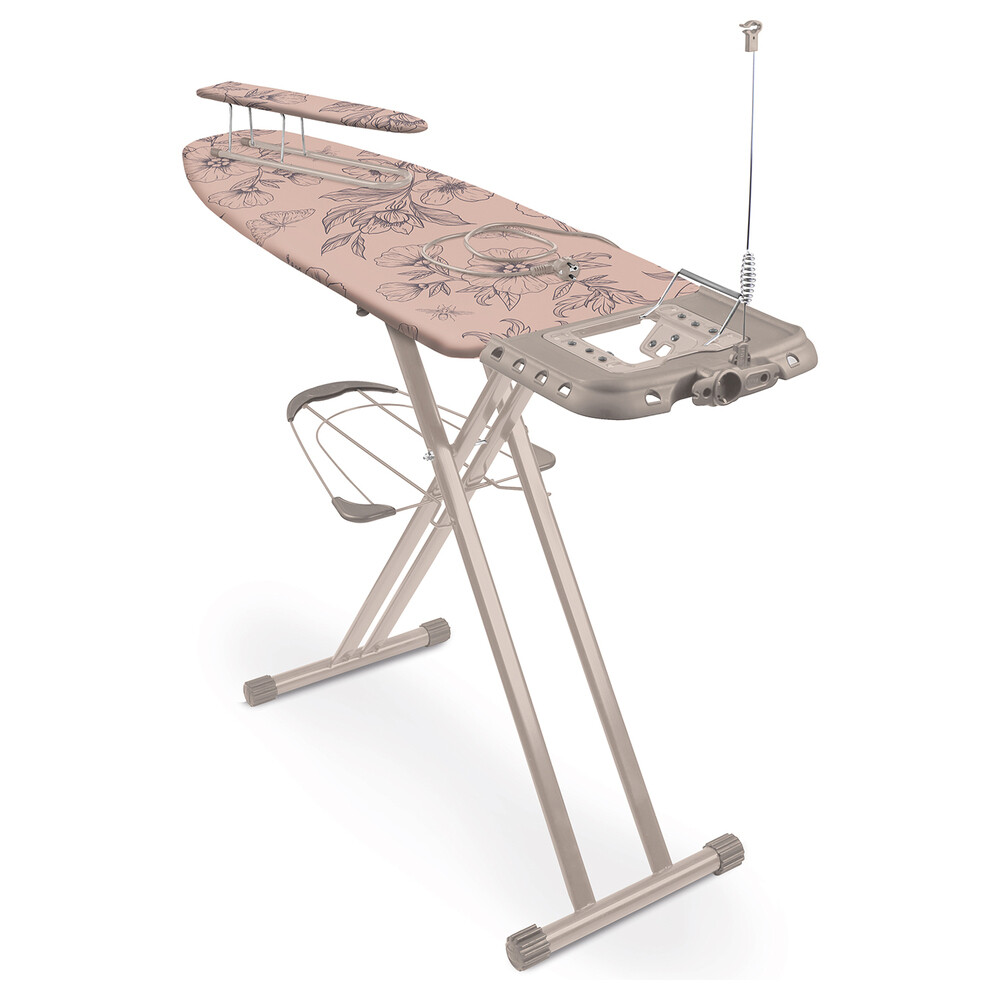 Надежная гладильная доска с металлической поверхностью, оснащенной отверстиями для пара. Съемный чехол выполнен из хлопка с термоустойчивым покрытием. Плавно регулируемая высота до 1 м, подходит для утюга и парогенератора. В комплекте кронштейн для провода утюга, полка для белья, электрический соединитель длиной 1,9 м и регулируемые опоры для устойчивости на неровном полу. Фиксируется в сложенном виде. Максимальная нагрузка на гладильную поверхность 25 кг.