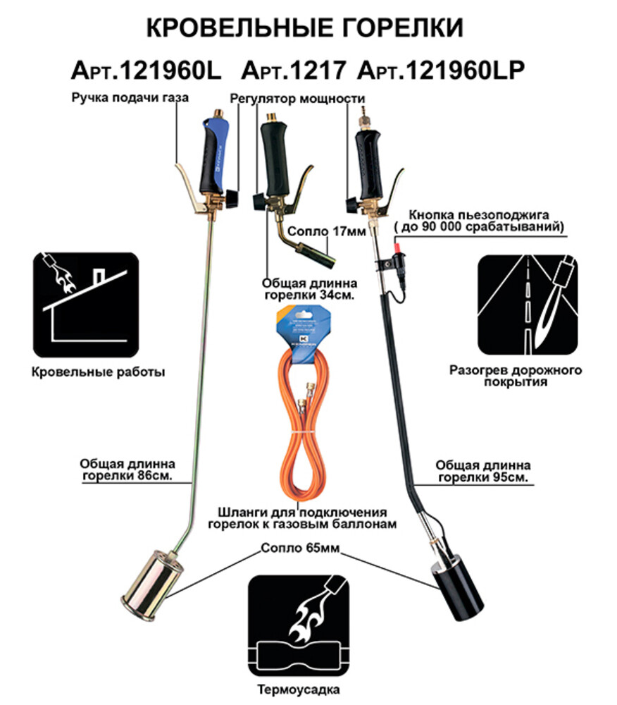 Применяется с многоразовыми газовыми баллонами 5, 12, 27, 50, 100 л (через шланг/ редуктор). Для подключения кровельной горелки к баллону можно использовать шланг любой длины.