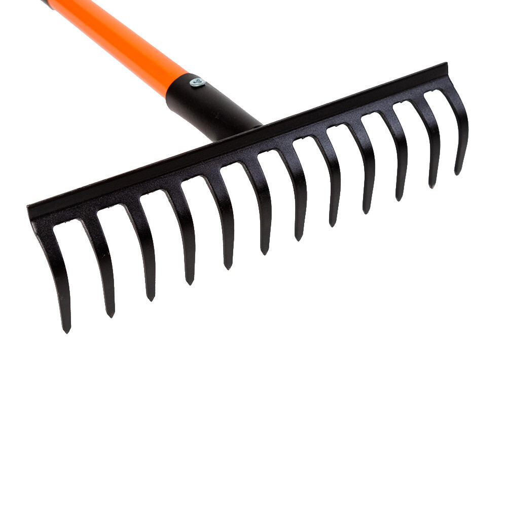Прямые зубья отлично удерживают сухой мусор, что увеличивает скорость работы. Металлический черенок надежно зафиксирован и обеспечивает комфортную работу.