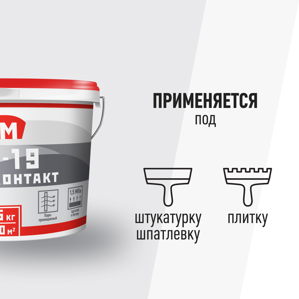 Предназначен для предварительной обработки гладких, невпитывающих или слабо впитывающих оснований перед нанесением гипсовых, цементных и рельефных декоративных штукатурок, шпаклевок, для обработки ГКЛ перед облицовкой керамической плиткой, перед нанесением клея для плитки. Не рекомендуется для обработки поверхностей перед нанесением тонкослойных декоративных штукатурок. Пригоден для обработки старых, но прочно держащихся масляных и алкидных красок. Для внутренних и наружных работ. Паропроницаемый. Без запаха.