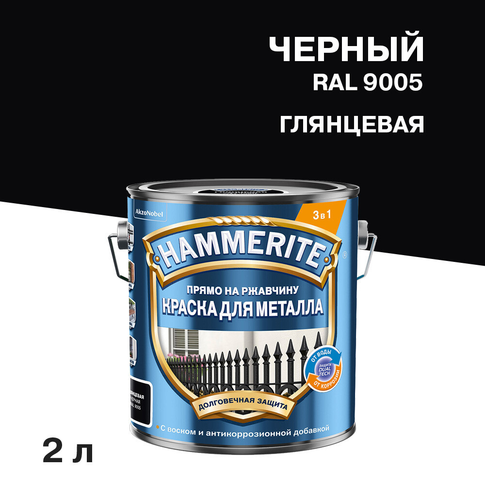 Грунт-эмаль по ржавчине 3в1 Hammerite черная RAL 9005 гладкая глянцевая 2 л
