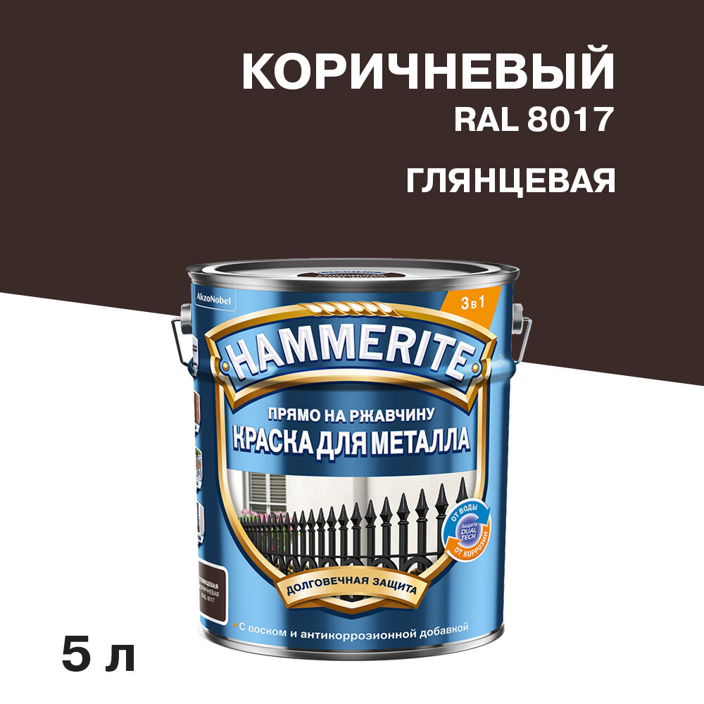 Грунт-эмаль по ржавчине 3в1 Hammerite коричневый RAL 8017 гладкая глянцевая 5 л