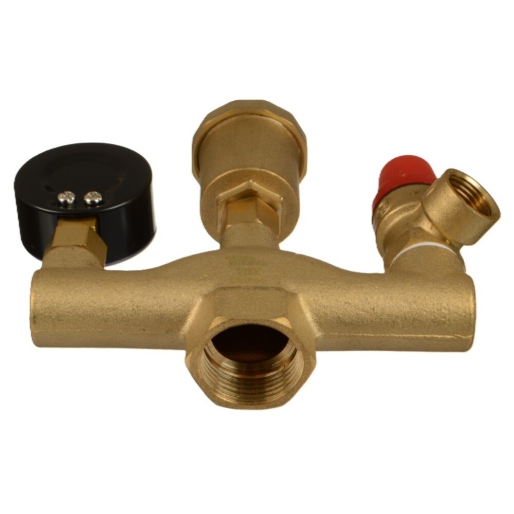 Предназначена для защиты системы отопления от превышения максимально допустимого рабочего давления. Выполнена из латуни. Представляет собой набор предохранительных элементов, размещенных на отдельном коллекторе, подключенном к системе отопления с помощью резьбовой муфты. В состав группы безопасности входят предохранительный клапан с фиксированной настройкой на 3 бар., автоматический воздухоотводчик и манометр.