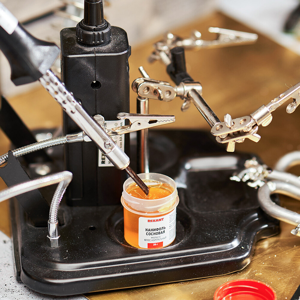Канифоль сосновая марки А 20 г REXANT предназначена для удаления тонких и нестойких оксидов с поверхности под пайку, улучшения растекания жидкого припоя при пайке печатных плат и радиокомпонентов.