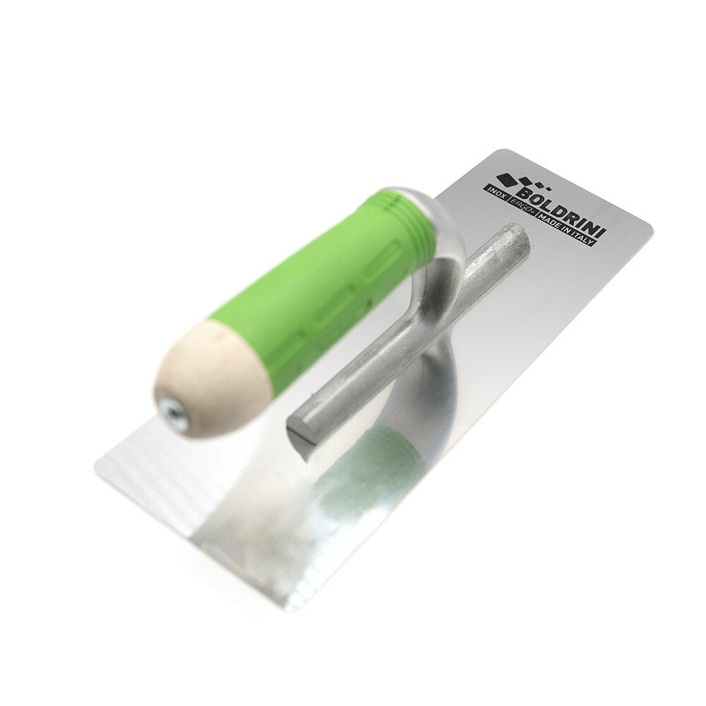 При помощи кельмы Boldrini наносится большинство декоративных покрытий — венецианские и фактурные штукатурки, покрытия под шелк, лессирующие финитуры и воски. Лезвие выполнено из нержавеющей стали методом сварки, что гарантирует устойчивость к высоким нагрузкам. Деревянная ручка с пластиковым ободом обеспечивает надежность обхвата, гарантируя высокую производительность.