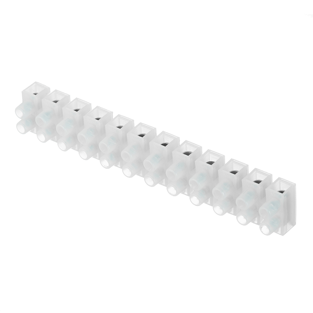 Соединение осуществляется с помощью медных контактов. Кабели и провода фиксируются винтовым зажимом. Клеммная колодка изготовлена из полупрозрачного полиэтилена.