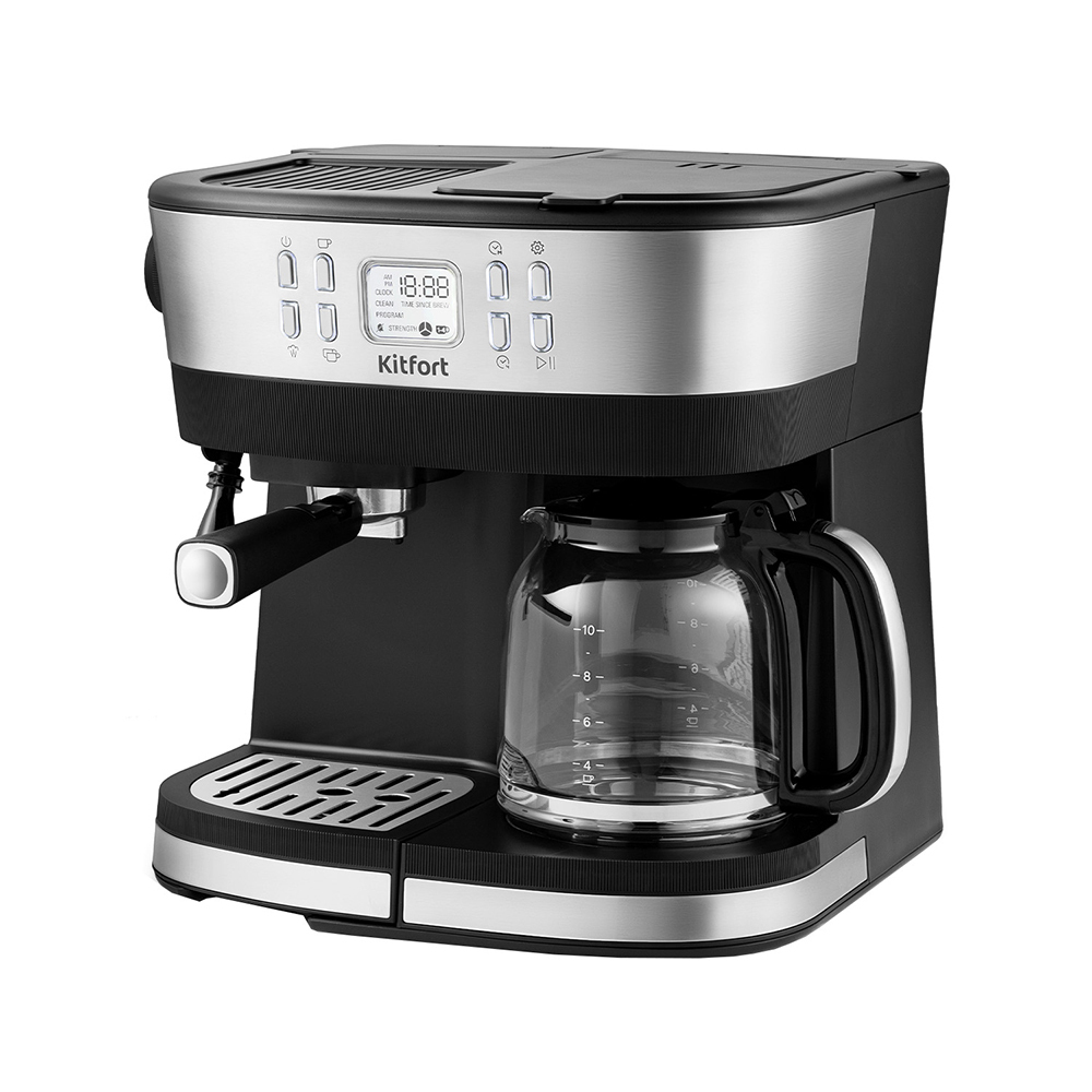 Кофейная станция Kitfort KT-771 совмещает в себе два вида кофеварок: рожковая и капельная. Управление рожковой кофеваркой расположено слева. У капельной кофеварки есть LCD-дисплей с понятными обозначениями всех программ в правой части. Вы можете узнавать даже текущее время по часам на дисплее или настроить крепость вашего фильтр-кофе. Молочную пенку для капучино можно делать самостоятельно. Капучинатор в кофеварке — это паровая трубка с насадкой панарелло. Трубку погружают в холодное молоко, включают подачу пара и взбивают молочную пенку. Капельная кофеварка оснащена многоразовым нейлоновым фильтром, который удобно мыть после приготовления кофе и использовать снова. Кофеварка оснащена двумя индивидуальными резервуарами для воды. Резервуар капельной кофеварки емкостью 1,5 л позволяет за один раз приготовить кофе на 10 больших порций по 150 мл. Рожковая оснащена резервуаром в 800 мл. Мерная ложка-темпер поможет наполнить рожок и утрамбовать в нем кофейную таблетку. Металлические фильтры для одной и двойной порции эспрессо с лазерным нанесением отверстий долговечны и не требуют использования каких-либо расходующихся частей.