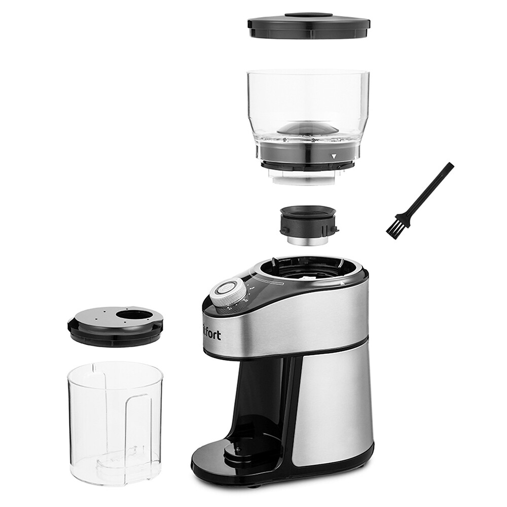 Контейнеры для молотого кофе и для зерен съемные. Внешний жернов также съемный для удобства очистки. Для чистки жерновов в комплекте с кофемолкой идет маленькая щеточка.
