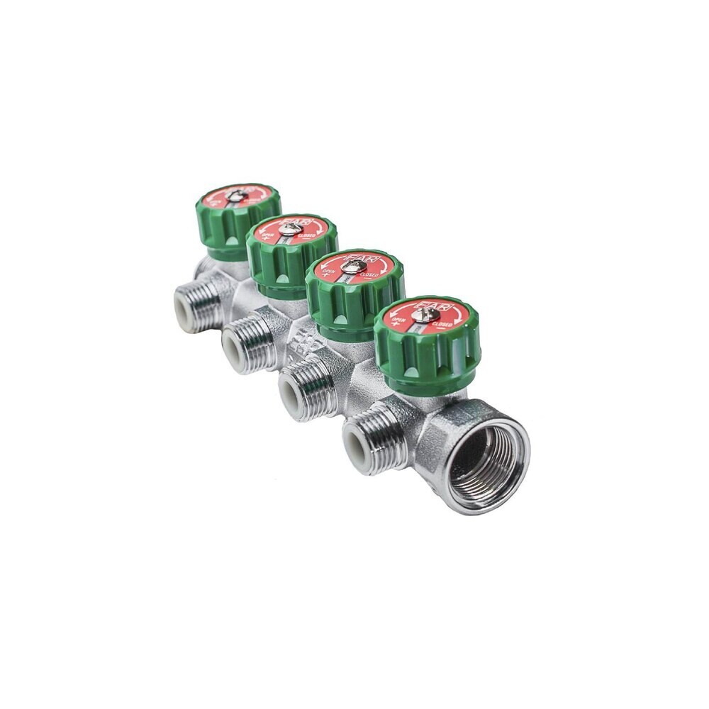 Коллектор регулирующий 3/4″ ВР-НР с 4 отводами 1/2″EU, с вставкой под плоское уплотнение.