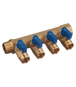 Коллектор Tiemme 3/4 ВР(г) х 4 выхода 1/2 НР(ш) ЕК х 3/4 НР(ш) с шаровыми кранами (1820039/1820016)