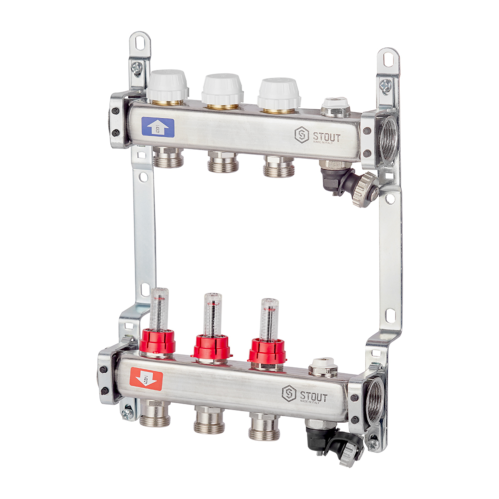 Коллекторная группа с расходомерами нержавеющая сталь Stout 1 ВР(г) х 3 выхода 3/4 НР(ш) ЕК х 1 ВР(г)