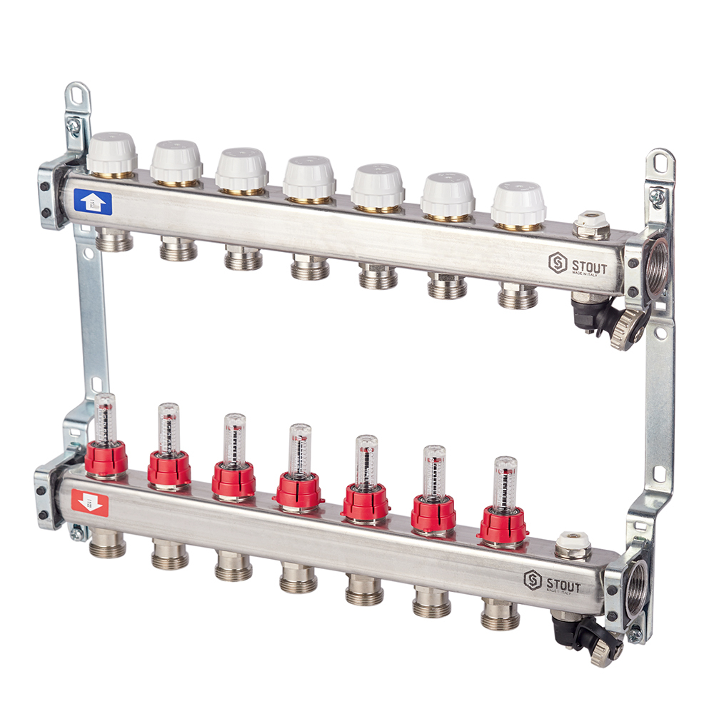 Коллекторная группа с расходомерами нержавеющая сталь Stout 1 ВР(г) х 7 выходов 3/4 НР(ш) ЕК х 1 ВР(г)