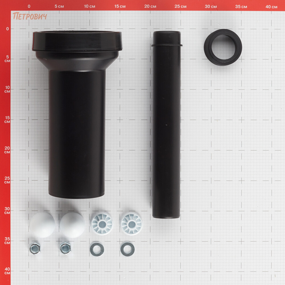 Фановая труба – 1 шт., патрубок с манжетой – 1 шт., крепежные гайки – 1 комплект, белые декоративные заглушки – 1 комплект.