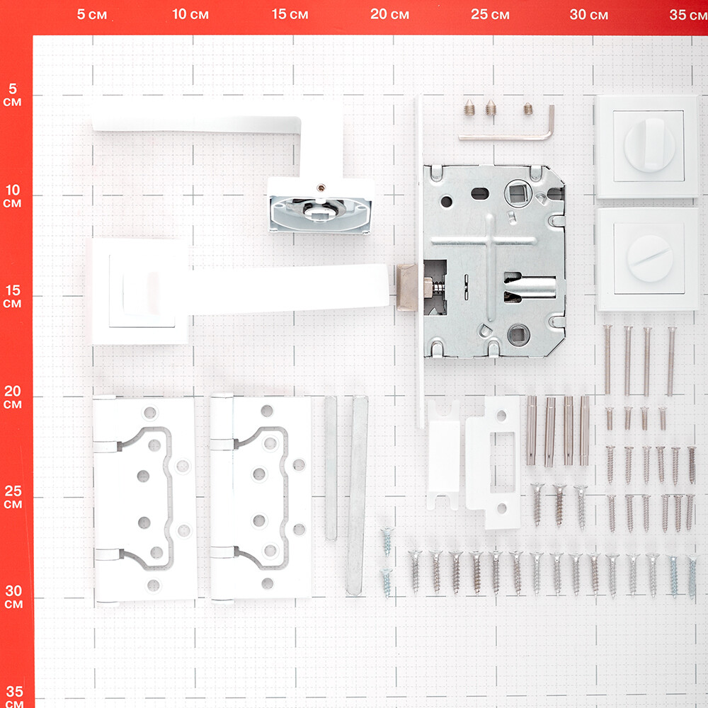 Комплектация: ручка на розетке — 2 шт, петля накладная универсальная 100х75х2,5 мм — 2 шт, стяжка (стягивающая втулка) — 2 шт, замок межкомнатный под фиксатор — 1 шт, накладка-фиксатор — 2 шт, стержень квадратный соединительный 8х8 мм — 1 шт, стержень квадратный соединительный 6х6 мм — 1 шт, шестигранный ключ — 2 шт, комплект крепежа, инструкция.