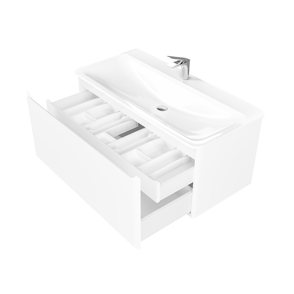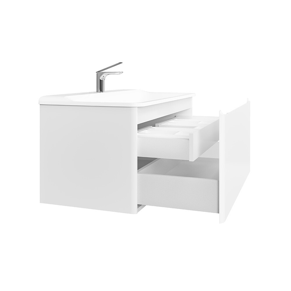 Тумба с раковиной из коллекции Welto бренда Raval – это сочетание практичности и минималистичного дизайна. Компактный выдвижной ящик освобождает пространство под тумбой для дополнительного использования. Плавное скругление углов и интегрированные ручки делают комплект максимально безопасным. Полноразмерная вкладная раковина из литьевого мрамора проста в уходе и устойчива к загрязнениям. Фасады тумбы изготовлены из МДФ и покрыты глянцевой пленкой ПВХ.