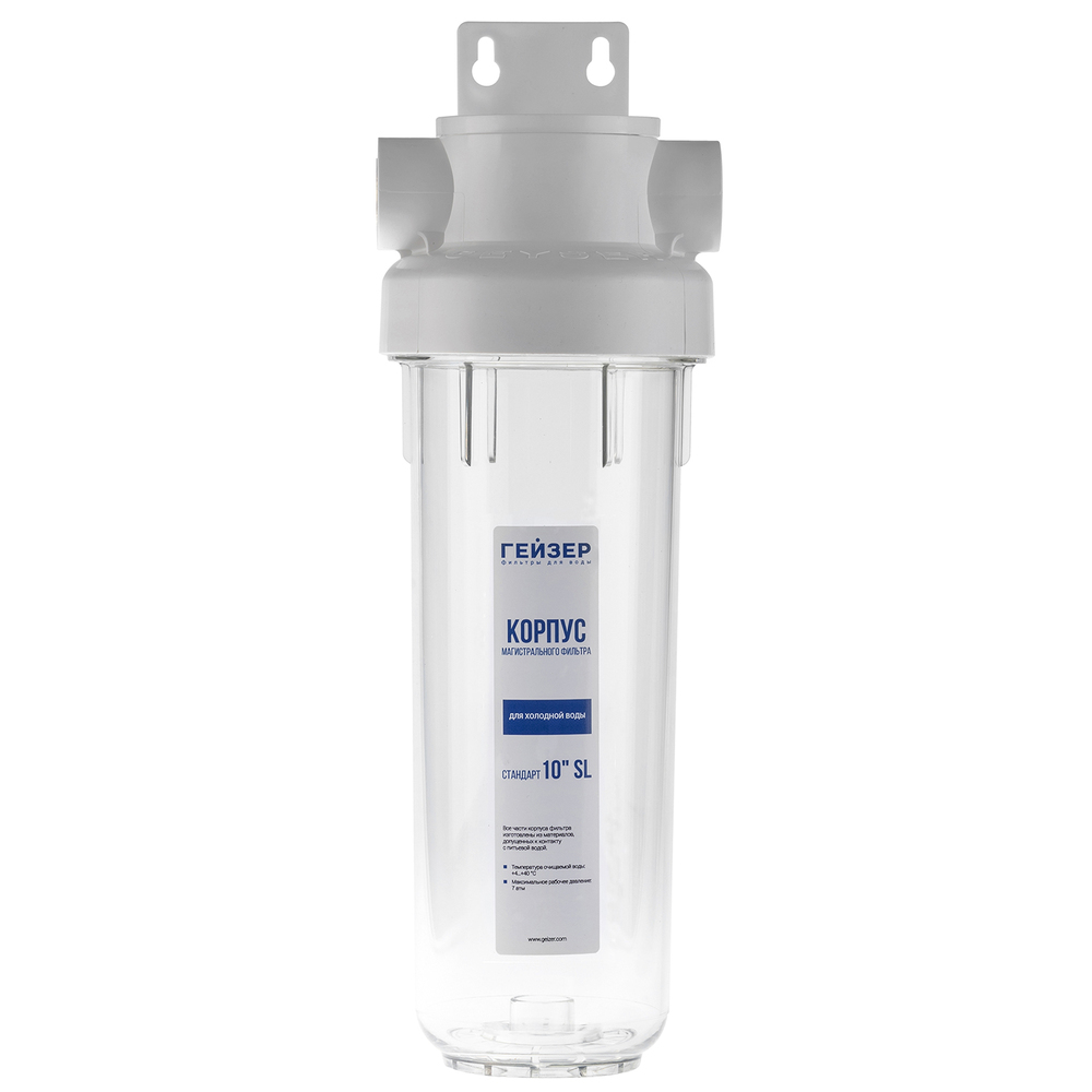 Корпус фильтра Гейзер Гарант 1/2″ 10SL рассчитан на работу под давлением и установку на входе в систему холодного водоснабжения. Выполнен из суперпрочного пластика ПЭТ пищевого класса, который обладает повышенной стойкостью к механическим повреждениям.
