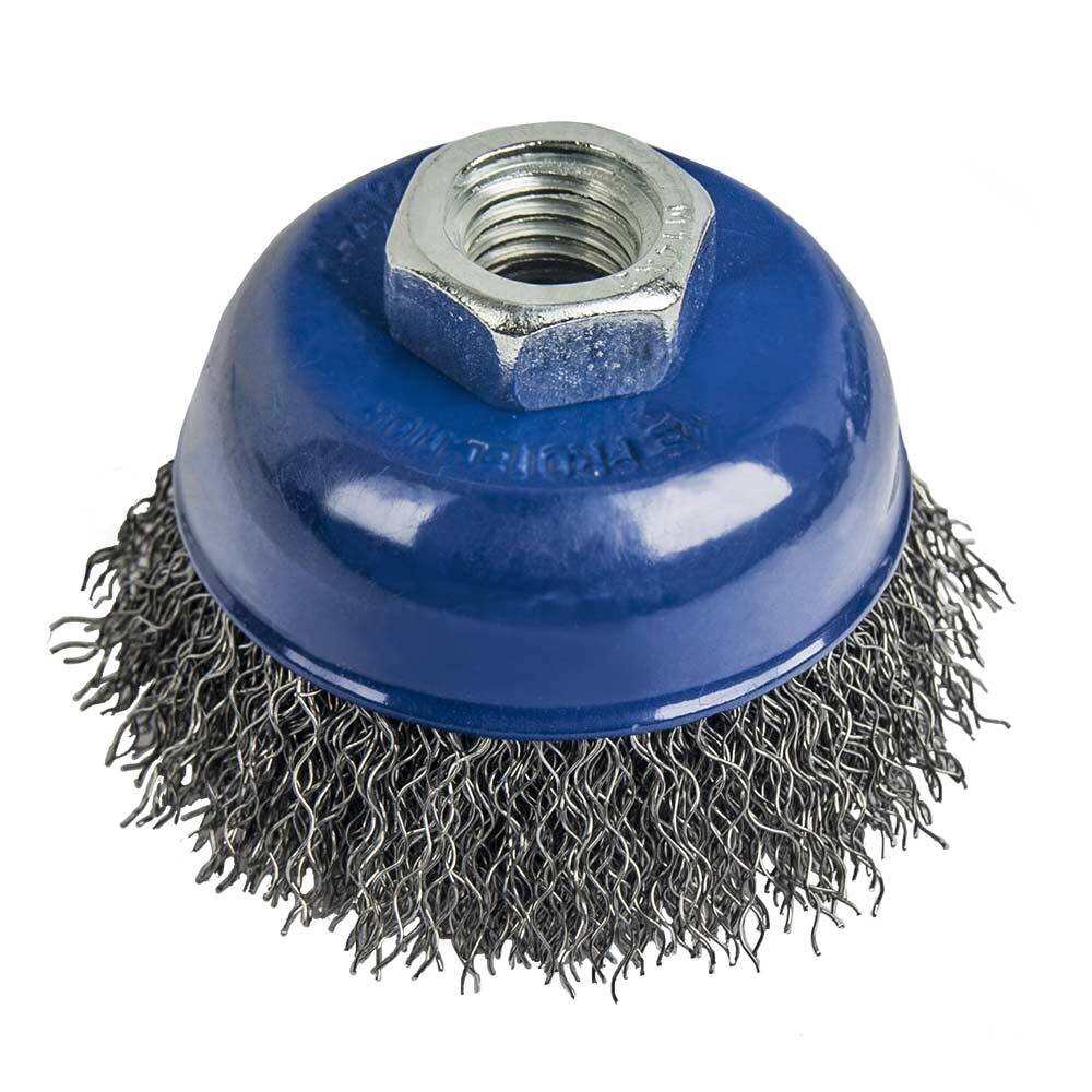 Чашеобразная кордщетка для угловых шлифмашин до 12500 об/мин. Резьбовая посадка на шпиндель. Гофрированная стальная проволока. Для обработки дерева, снятия краски, шлифовки металла, снятия ржавчины, обработки сварных швов.